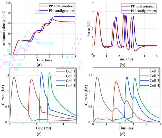 In Figure 8 and Figure 9, the velocity variation curves of the armature from the first to the fourth stage in the PP and PN configurations of the launching device are shown in Figure 8a and Figure 9a, respectively. The axial force variation curves are shown in Figure 8b and Figure 9b. The current curves of each drive coil in the PP configuration are shown in Figure 8c and Figure 9c, and the current curves in the PN configuration are shown in Figure 8d and Figure 9d. The armature triggering is performed according to the optimal , , , and obtained from the previous simulation experiments for both the PP and PN configurations. It is observed that in the coil launching device with an inter-stage distance of D = 15 mm, the optimized PN configuration achieves higher velocity than the PP configuration, which is consistent with the conclusions obtained by scholars in recent years (i.e., reverse current in the coil helps to improve the exit velocity of the armature). However, in the coil launching device with an inter-stage distance of D = 5 mm, the velocity of the PN configuration does not surpass that of the PP configuration. The following analysis is conducted to explain these phenomena.
