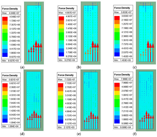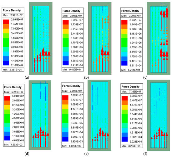 Axial force density (with units of ) of the armature with an inter-stage distance of D = 5 mm: (a) PP at 1.11 ms; (b) PP at 1.60 ms; (c) PP at 1.98 ms; (d) PN at 1.44 ms; (e) PN at 2.09 ms; and (f) PN at 2.58 ms.