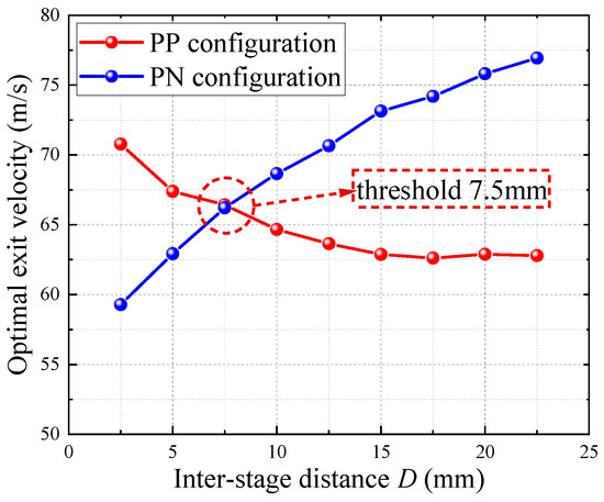 It can be observed from Figure 14 that as the inter-stage distance of the drive coils in the SICL increases, the optimal exit velocity of the PP configuration device gradually decreases and tends to stabilize, while the optimal exit velocity of the PN configuration device gradually increases and tends to stabilize. The intersection point of the two curves represents the threshold value of the inter-stage distance, which is 7.5 mm in this case, accounting for 37.5% of the length of the drive coils. When the inter-stage distance is smaller than this threshold value, the coil launching device using the PP configuration will achieve a better armature exit velocity. Conversely, when the inter-stage distance is larger than this threshold value, the coil launching device using the PN configuration will achieve a better armature exit velocity.