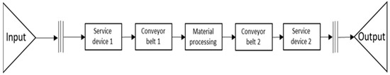 The scheme consists of several parts. The input part represents the material intake, which in the real world may represent the extraction of debris in a mine. In the laboratory environment, this debris is simulated using wooden balls. Bin 1, which in the real world is a heap or pile of debris, is a container filled with simulated material in the laboratory. Service device 1, which represents a robotic manipulator with a scoop in the laboratory, is an excavator used for collecting debris in actual operation.