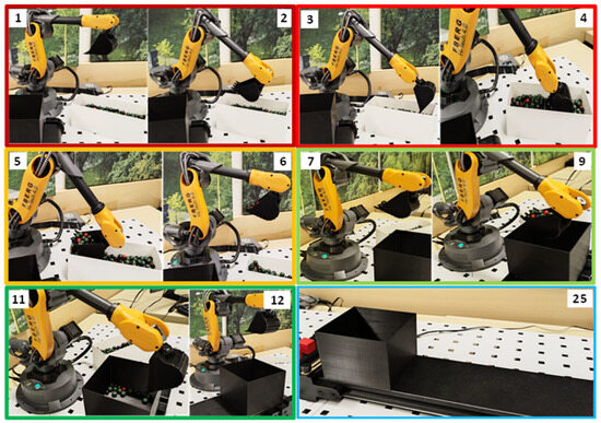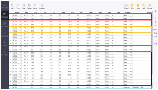 The first phase of the second step is exclusively focused on “Station 1”. As mentioned in the previous section, the main goal of this station is to take the material from the prepared container, move over the container located on the conveyor belt, and empty the material from the spoon into the container. This process is repeated twice by the robotic arm. Subsequently, the conveyor belt is activated and moves the container with the material along the belt, followed by a simulated material processing operation. The process of programming such a group of movements is demonstrated in the same way as in the previous simulated model. To achieve this, it is first necessary to display the program from the WLKATA Studio software interface, and then each line of the program is displayed using a photograph of the position of the robotic arm and other elements of the simulated “Mining Operation—Station 1” system. The color border of the line in Figure 4 corresponds to the color frame of the photograph showing the position of the manipulator [13].