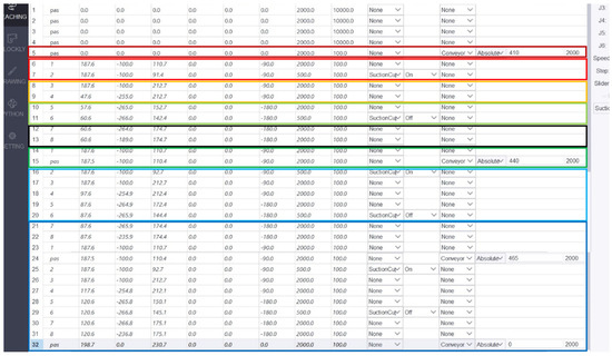 To enable cooperation between “Station 1” and “Station 2” to create a unified logistic process, it is essential to delay the launch of “Station 2” until “Station 1” completes its cycle. The first step in assembling the system is to teach the robot and other elements of the model system a series of movements to be logically arranged. Later, the timing of launching “Station 1” will be adjusted so that “Station 2” starts only after the “Station 1” cycle ends. Individual movements are displayed in the software interface in Figure 6 from line 5 onwards. The first five lines in the software interface represent a time correction. The procedure is the same as in the previous workstation. First, it is necessary to display the program from the WLKATA Studio software interface, and then each line of the program will be displayed using a photograph of the position of the robotic arm and other 7elements of the simulated system at Station 2; see Figure 7. The color border of the line in Figure 6 corresponds to the color frame of the photograph, showing the manipulator’s position.