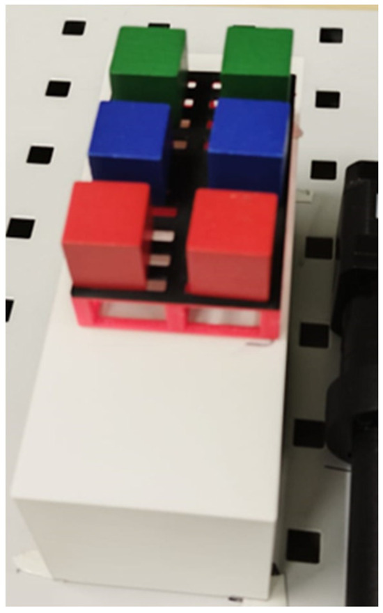 These movements are like those in lines 9, 10, and 11 but in the opposite direction. They do not need to be shown again in the photographs. The movement in line 14 mirrors the movement of the robotic arm in line 6. Then, the conveyor belt moves to a position where the robotic arm does not need to make any further movement. This movement is depicted in line 15. Lines 16, 17, 18, and 20 are the same as lines 7, 8, 9, and 10, except for line 19, which corrects one of the axes of the robotic arm. This series of movements is repeated to pick up the third and final group of material from the conveyor belt and transfer it to the pallet with the plastic pallet. Line 32 is used to move the robotic arm and conveyor belt to the starting position. Figure 8 shows the positioning of the blocks after completing the cycle at “Station 2”.