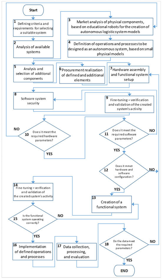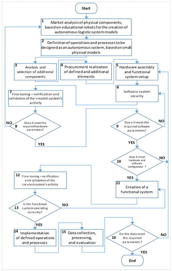 - If not, the algorithm returns to block no. 1, where physical elements of the market based on educational robots for creating models of autonomous logistic systems are analyzed. This means that the hardware does not meet the requirements for creating models of autonomous systems in a laboratory environment. The selection of another type of hardware must be considered. If the system operates according to the specified criteria, the algorithm proceeds to block no. 9.
