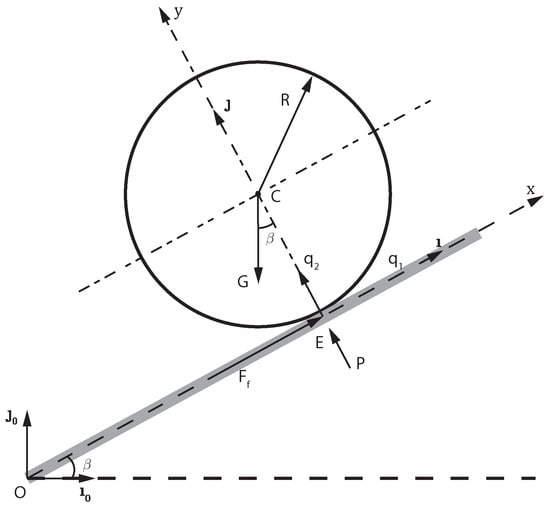 To describe the instantaneous configuration of the ball, the generalized coordinates , , and are attached. The generalized coordinate denotes the contact point displacement along the x-axis. The generalized coordinate indicates the contact point displacement along the y-axis, and the coordinate defines the ball’s rotation.