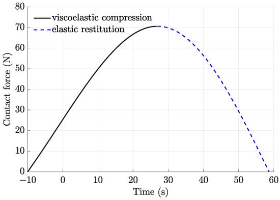 The contact force used in the study is a hybrid model. The compression model has an elastic force and viscous damping, whereas restitution is solely elastic. Figure 2 depicts an example of contact force.