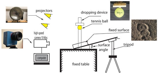 A mechanical arm that can travel vertically was used to release the ball from different heights in the range of 0.2–0.4 m. Tennis balls with a diameter of 0.067 m and a mass of 0.0567 kg were used for the experiments. For each height, at least three consistent drops were conducted. The flat surface was attached to the tripod at one side, so the incline angle of the impacting surface could be adjusted by changing the tripod’s height. A high-speed digital camera was used to record every drop. The camera was mounted to a tripod, and the angle was always parallel to the dropping surface. The incline angle of the camera and the impact surface were controlled precisely with a digital angle gauge with a precision of ±0.5°.
