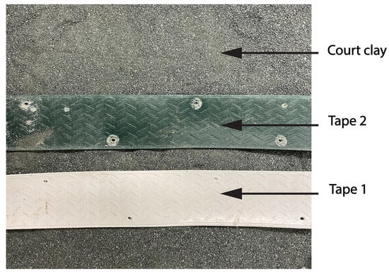 Figure 5 shows the clay tennis surface, and tape 1 and 2 on the clay. Experiments are carried out on clay surfaces; later, tapes were positioned over the clay and carefully fixed with tape nails. Later, the investigations were repeated with the same dropping heights and impact angles.