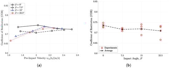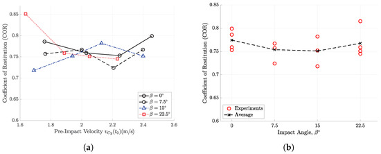 The general behavior of the coefficient of restitution is graphically investigated in the following section. Each data point in Figure 6, Figure 7 and Figure 8 illustrates the mean of three experiments repeated at the same drop height, the same impact angle, and on the same surface.