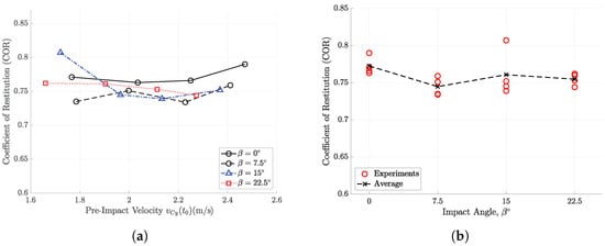 Figure 9b shows the normal and tangential components of the displacement for both the theory and one of the experimental results with . The analysis of the experiment shows that the initial velocity is and the final velocity is . The simulation outcome is . The errors between tangential and normal velocity components are and , respectively.