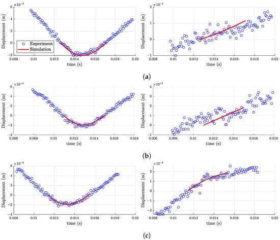 Figure 9c depicts the normal and tangential components of the displacement for both the theory and one of the experimental results with . The analysis of the experiment shows that the initial velocity is and the final velocity is . The simulation outcome is . The errors between tangential and normal velocity components are and , respectively.