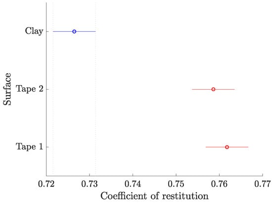 Figure 10 shows a pairwise comparison of the mean coefficient of restitution for different surfaces. The mean coefficient of restitution on clay is , whereas the mean coefficient of restitution on white and green tapes is and , respectively. The procedure suggests a statistically significant difference between the impact on the granular surface and line tapes.