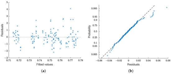 (a) Studentized residuals vs. fitted values plot. (b) Normal probability of residuals plot.