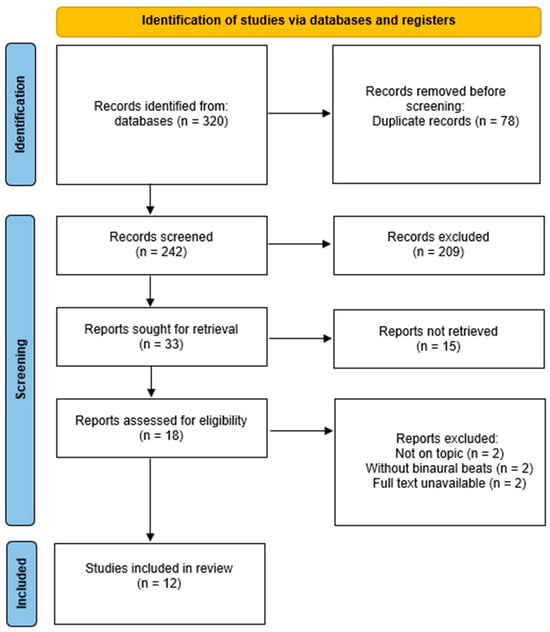 This research was conducted on 27 April 2024 using the MEDLINE, PsychINFO, EMBASE, CENTRAL, ISRCTN, and ICTRP databases, where we used combinations of the following keywords: “Binaural AND Anxiety”—101 results; “Binaural AND Depression”—59 results; “Binaural AND Neuroplasticity”—18 results; “Binaural AND Stroke”—19 results; “Binaural AND Neuro* diseases”—47 results; “Binaural AND Neurological diseases”—2 results; “Binaural AND Injury”—48 results; and “Binaural AND Brain injury”—26 results. In total, we obtained 320 results.