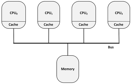 Example of a simplified multiprocessor architecture with four CPUs and their corresponding caches sharing memory.