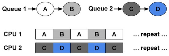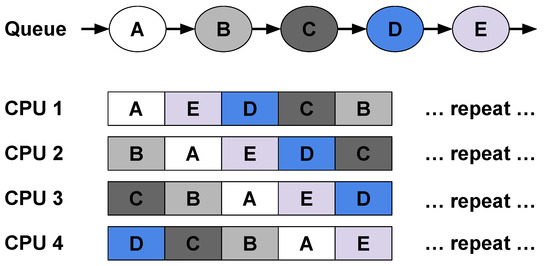 Figure 3. Example of a multiprocessor system with four jobs using a multi-queue setup. Adapted from [3].