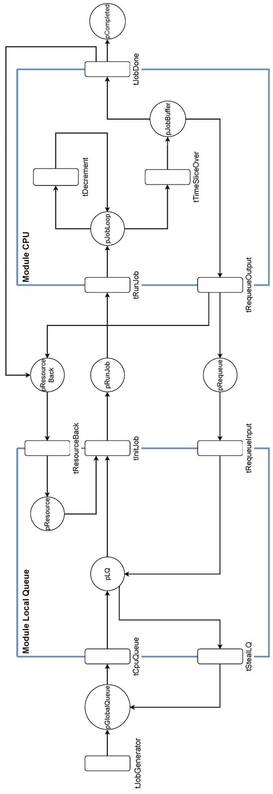 Increase/decrease CPU count: adjusting the simulation to increase or decrease its scale is a time-consuming process involving the copying and customization of all necessary files for each CPU, each configured to match its respective CPU index. This approach is prone to bugs, as it becomes challenging to identify instances where, for example, CPU3 might inadvertently utilize queue data intended for CPU2. An intriguing extension would involve the use of generics or a parser that allows the creation of the Petri net through a graphical user interface. This enhancement could simplify the scaling process for varying counts, providing a more user-friendly experience.