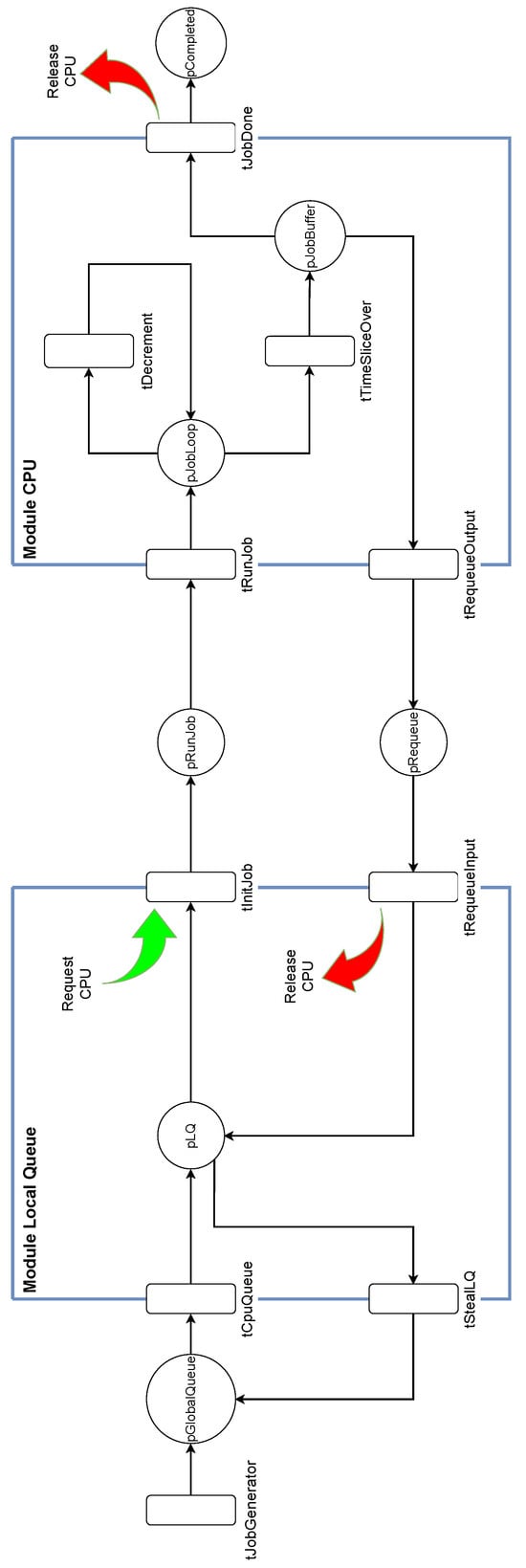 MLFQ adheres to the rules outlined in the bullet points below [3]. Some rules have been adapted to enhance compatibility within a Petri net model.