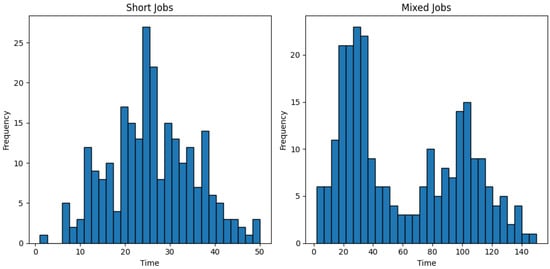 The distinct patterns observed in the CFS for the short and mixed datasets reveal interesting dynamics in job processing. CFS exhibits several spikes in both the short and mixed datasets. These spikes are likely linked to jobs with low niceness and/or low running time. Initial jobs often experience high throughput, as indicated by Equation (3), which calculates the time slice based on having only a single job in the queue, resulting in a higher time slice than it should likely have. Following the initial spikes, CFS maintains a more consistent but lower throughput, occasionally experiencing higher throughput for specific jobs. These variations show the adaptability of CFS to different workload scenarios, with the scheduler dynamically adjusting to the characteristics of the jobs in each dataset.