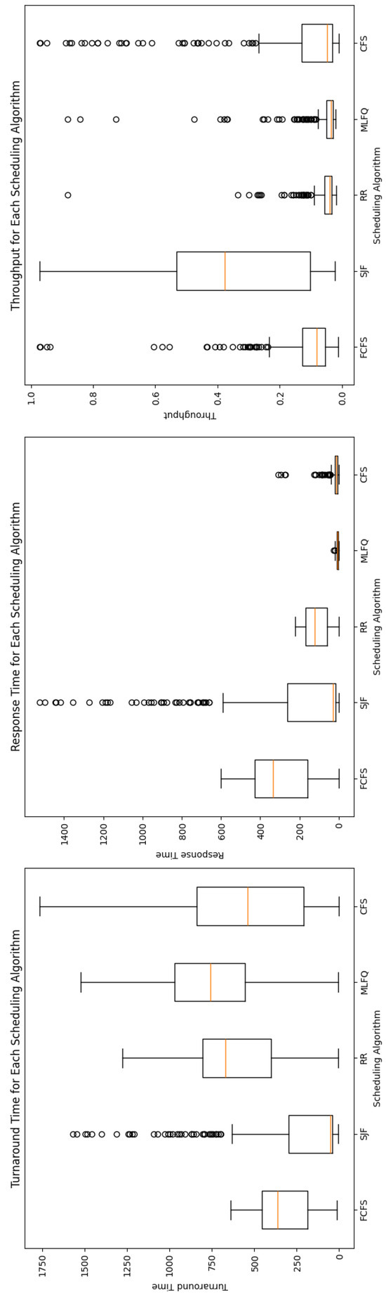 In Section 6, we put the developed platform to test; after examining the results (Section 6.2), we can conclude that CFS and MLFQ stand out as superior scheduling algorithms. They perform well overall and do not rely on prior knowledge of job running times, which is unrealistic and a drawback for SJF. While fair, the RR scheduler has inherent issues, especially when dealing with a high number of simultaneous jobs in the queue. This leads to low throughput and, in some cases, poor response time.