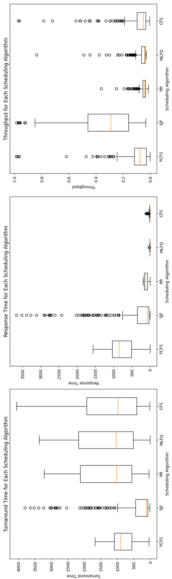 FCFS and SJF demonstrate similarities in their response time patterns, mirroring their turnaround time due to their scheduling policies. FCFS follows a linear trend, while SJF introduces significant variance in response time, mainly due to the starvation of long jobs. The big variance in response time for SJF is also seen in the box plots from Figure 8 and Figure 9. Given that both FCFS and SJF perform poorly in response time, they would not be suitable schedulers for regular computers where responsive handling of mouse and keyboard inputs is crucial.