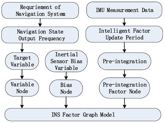 The efficacy of INS heavily relies on the high-frequency measurement of carrier motion states facilitated by the Inertial Measurement Unit (IMU). This frequency is typically considerably higher than the output frequency of the navigation system. Consequently, the INS measurement data contain a substantial amount of redundant information compared to the navigation system output. Therefore, the idea of equivalent factors can be adopted [28] when establishing the INS factor graph model. State variables requiring output are introduced as variable nodes. The IMU measurement data between consecutive time points of adjacent variable nodes is integrated and defined as equivalent factor nodes. This approach serves to reduce the update frequency of factor nodes, thereby enhancing the real-time performance of the algorithm.