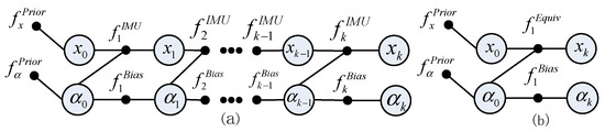 The comparison between IMU factor and equivalent IMU factor. (a) Factor graph model using IMU factor; (b) Factor graph model using equivalent IMU factor.