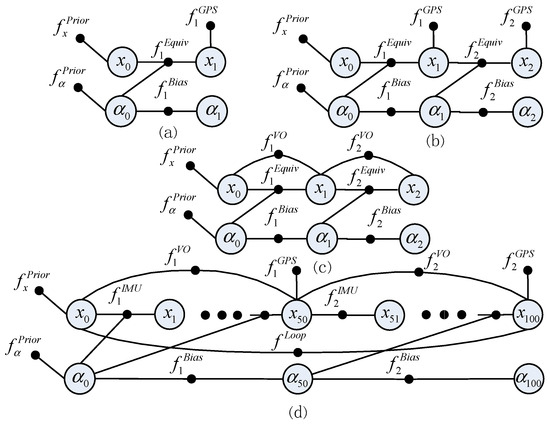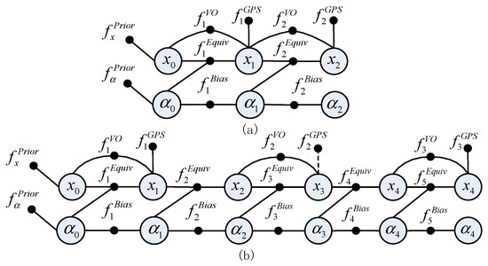 From Equations (3), (5), and (6), the equivalent IMU factor node is connected to the state variable node , bias variable node , and state variable node ; The bias factor node connects the bias variable node and the bias variable node . Figure 3a,b shows the factor graph models at two distinct time intervals. New nodes are continually integrated into the model as time progresses; therefore, the INS factor graph model is actually a dynamic graph model.
