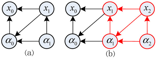 The factor graph model intuitively manifests as the increasing number of variables in over time. It is clearly unable to meet the real-time requirements of the system, if every factor graph inference involves re-solving the optimal estimate for all variables . Taking the factor graph model shown in Figure 3a as an example, variable elimination [36] is adopted and all nodes are eliminated from the factor graph by the order of , as shown in Figure 4a. A Bayesian network is a directed acyclic graph that encodes the conditional densities of each variable. The Bayesian network is equivalent to the upper triangular matrix resulting from the Jacobian matrix factorization [37], thereby representing the square root information matrix of the system. The corresponding Jacobian matrix and the upper triangular matrix at time , as shown in Figure 3a and obtained through a QR factorization of , take the following form