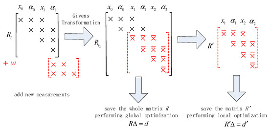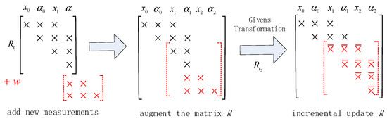 From Equations (20)–(22), non-zero terms emerge below the diagonal of when incorporating new measurements into the current measurement Jacobian matrix and upper triangular matrix . Exploring the prospect of localized QR decomposition on the upper triangular matrix segments with non-zero terms below the diagonal yields a fresh upper triangular matrix . Analogously, the residual terms are derived through corresponding operations. Figure 6 shows a schematic diagram of the incremental matrix calculation.
