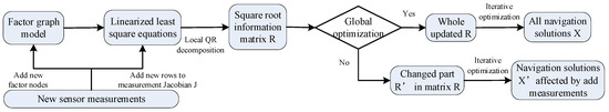 At each moment, when new sensor measurements are added to the integrated navigation system, corresponding factor nodes and variable nodes need to be added to the factor graph model, which is equivalent to adding new rows to the linearized least squares equations of the system. Due to the fact that newly added sensors only affect their adjacent state variables, local QR decomposition can be used to update the changing parts of the square root mean information matrix R in the system. The state variables that generate changes can form an adaptive window, and only the state variables X’ within that window are optimized and solved at each moment. Global state variables optimization is performed according to the system requirements. The system requirements here can be manually set, such as conducting global optimization every certain time or completing a certain maneuver task, depending on the computational requirements for algorithm complexity. The AFIS program flow chart is shown in Figure 8.