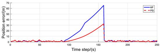 This section focuses on integrated INS/GPS navigation within Scenario 1, assuming a synchronous output frequency between INS and GPS, with the GPS measurements being unavailable during the period from 90 s to 160 s. The objective is to compare the fusion accuracy of the Kalman filtering (KF) and factor-graph-based (FG) method without time delay in measurement. The evaluation specifically examines the factor graph algorithm’s capacity to accommodate dynamic changes in sensor effectiveness. Figure 9 shows the real-time position error of both KF and FG.