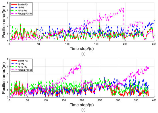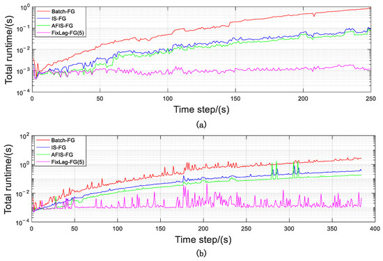 From Figure 12 and Table 3, it is evident that FixLag (5) exhibits the shortest optimization time, clocking in at 0.2665 s in scenario 1 and 0. 3971 s in scenario 2. This efficiency arises from its exclusive focus on optimizing and updating local state variables within the smoothing window at each moment. In contrast, the optimization times of Batch-FG, IS-FG, and AFIS-FG gradually escalate as simulation time progresses. Batch-FG stands out with the lengthiest optimization time, recorded at 54.6 in scenario 1 and 257.1 s in scenario 2. This is attributed to Batch-FG’s overarching approach, involving unified processing of all received measurements at all times. This approach is akin to batch processing, entailing the update of the system’s upper triangular matrix at each time, followed by global optimization.