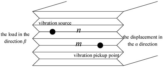 The displacement along the α direction at the m layer under the unit load along the direction β at the n layer is illustrated in Figure 4. kRj, , and represent the eigenvalue and eigenvector of the j-order mode in the m layer of the Rayleigh wave signature problem. kLj and represent the eigenvalue and eigenvector of the j-mode in the m layer of the Love eigenvalue problem, respectively. The calculation results are shown in Equations (20) and (21). Equation (20) is the fundamental solution of the displacement in the frequency–space domain under the point load. Equation (21) is the kernels of fundamental solutions.