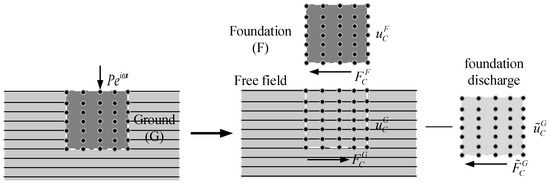 Based on the VM, the ground–foundation system can be divided into three parts: (1) the foundation part F, (2) free-field layered foundation G, and (3) soil discharge part with the same volume as the foundation. These three parts achieve dynamic coupling through the common nodes of foundation and foundation, that is, the ground–foundation system can be equivalent to (1) + (2) − (3).