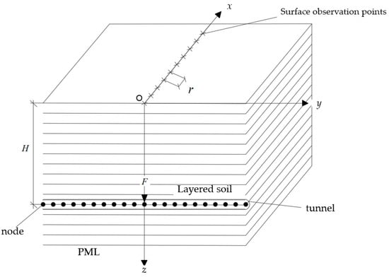 Based on the above assumptions, the tunnel–soil model is developed using the proposed TLM-VM-PML method. As shown in Figure 7, the TLM is used to simulate the layered soil. The elastic layer of the soil is divided into N thin-layer elements. The PML boundary conditions are used to simulate the elastic half-space below the elastic layers. The tunnel structure is simulated by the Euler–Bernoulli beam. The tunnel structure is set as a circular shield tunnel with outer diameter D, inner diameter d, wall thickness δ, elastic modulus Ep, mass density ρp, Poisson ratio νp, and rail buried depth H. According to the fundamental principle of the VM, the tunnel–soil interaction node group is set in the inner space of the foundation soil occupied by the tunnel structure. The depth of the node group is equivalent to the buried depth of the tunnel rail. The space coordinate system is established with the ground above the excitation point in the tunnel as the origin. The surface isometric observation points are set along the x axis with an interval of r.