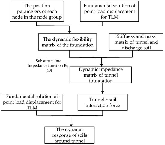 The research idea for solving the dynamic response of the model is illustrated in Figure 8. Firstly, the tunnel foundation is divided into elements to form a tunnel–soil dynamic interaction node group, which is located on the node surface of thin-layer elements. The spatial position coordinates of each node are calculated. Then, the basic solution of frequency–space domain displacement under point loads derived in Section 2.1 is introduced to form the dynamic flexibility matrix A(iω) of the common node groups of tunnel and foundation soil. The Euler–Bernoulli beam element is used to simulate the tunnel and its same-volume soil discharge. The impedance matrix S(iω) of the tunnel is obtained by calculating the stiffness matrix and mass matrix as well as the soil discharge and combining the impedance function Equation (40). Finally, the dynamic interaction force of the node group is obtained, and the displacement at any point of the foundational soil around the tunnel foundation can be calculated by combining the Green’s function of the TLM.