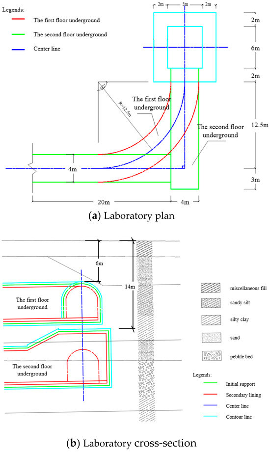 The test was conducted in a laboratory with an underground tunnel. The tunnel was a double-layer horseshoe-shaped tunnel. The underground first layer was a curved tunnel with a buried vault depth of 6 m, and the underground second layer was a straight tunnel with a buried vault depth of 14 m. The height and width of both layers were 4 m, and the wall thickness of the tunnel was 0.55 m. The plan and cross-section of the tunnel laboratory are shown in Figure 9. The underground excitation test was carried out in the underground first layer. In order to minimize the interference of external background noise, the test was carried out on a quiet night.