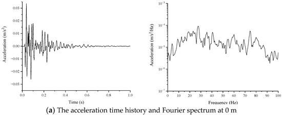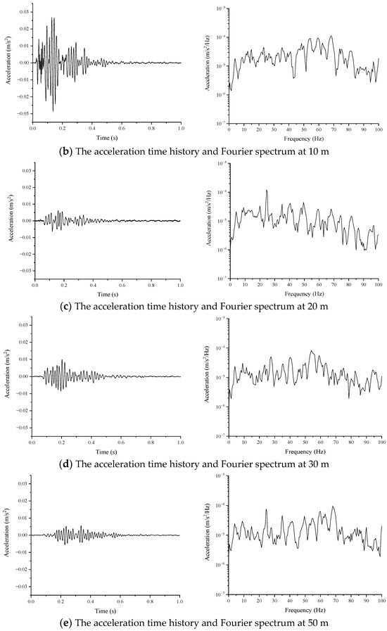 - It can be seen from the time history diagram that the maximum vibration acceleration occurs at different locations on the surface at different times. The maximum vibration occurs at about 0.04 s at 0 m on the surface, at about 0.2 s at 30 m on the surface, and at 0.4 s at 80 m on the surface, which also reflects the time difference of vibration propagation in the soil layer.