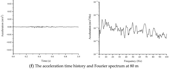 The time history and Fourier spectrum of the hammer force are illustrated in Figure 13. The peak value of the hammer force is about 40 kN. It can be observed from the spectrum that a large amount of energy can be aroused in the range of 0~100 Hz. The vertical acceleration time history and spectrum of the sensors between 0 and 80 m on the ground are shown in Figure 14.