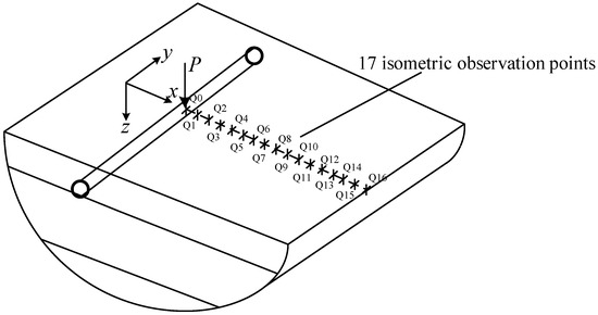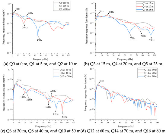 The displacement frequency response functions at different observation points in the tunnel–soil system under vertical unit harmonic load were calculated. The frequency calculation range is between 0 and 100 Hz, and the frequency resolution is 0.5 Hz. A total of 17 isometric surface observation points (Q0–Q16) perpendicular to the driving direction were selected from directly above the excitation point x = 0 m to x = 80 m. The distance between the two adjacent observation points is 5 m. The schematic diagram of each observation point on the surface is shown in Figure 15.