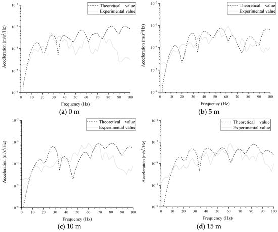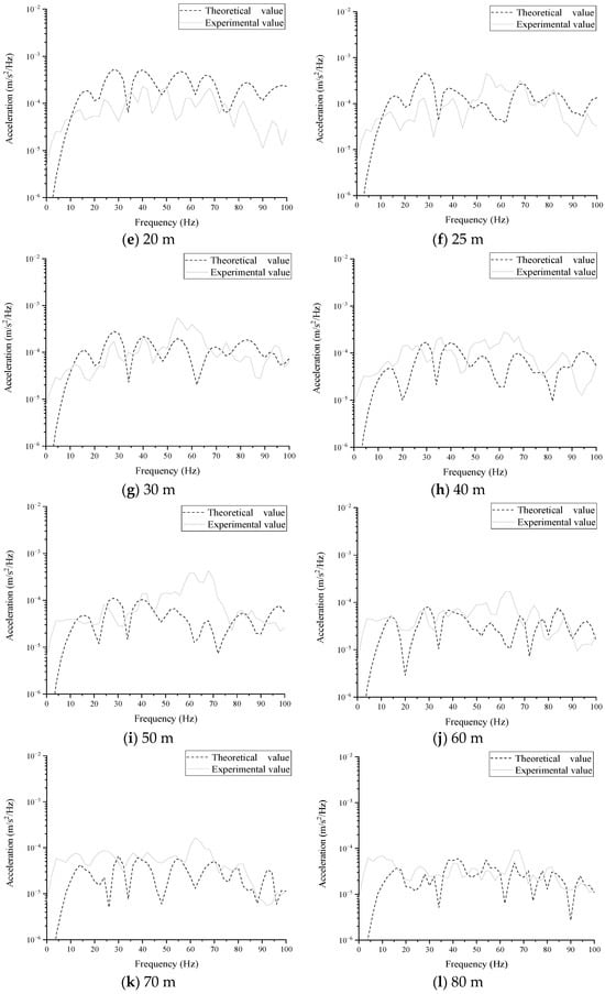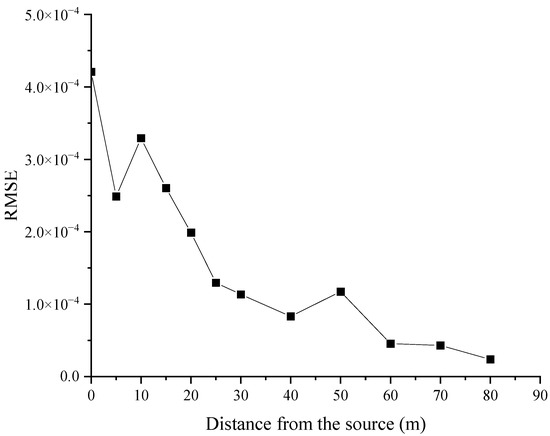 The Figure 17 calculated and experimental results are illustrated. It can be observed that the calculated results are close to the experimental ones, both exhibiting the fluctuation with frequency. The calculated and experimental ground vibrations are in good agreement in most frequency bands at 5, 30, and 80 m and tend to be consistent in most frequency bands but with a slightly different magnitude at 20, 25, and 30 m. Between 25 and 60 m, the experimental results are significantly larger than the calculated ones in the frequency band between 40 and 80 Hz. In general, considering that there are actually two layers of tunnels in the laboratory, the calculated model does not take into account the influence of the tunnel structure of the underground two-layer rail surface at a buried depth of 18 m. In addition, the actual soil layer parameters and tunnel structure were greatly simplified in the calculation process. In addition, the difference between the prediction and measurement results were measured by calculating the Root Mean Square Error (RMSE) of each position, as shown in Figure 18. It can be observed that the smaller the value of the RMSE, the closer the predicted result of the model is to the measured result. The RMSE gradually decreases with the increase in distance, and all magnitude values are one magnitude smaller than the curve. Combined with the comparison results, it is considered that the TLM-VM-PML can be used to study the analysis of the tunnel–foundation dynamic interaction.