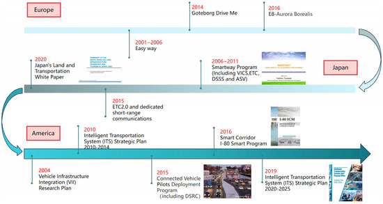 In a broad sense, the concept of smart highways emerged earlier in developed countries, dating back to the 1940s [15], including the United States [16,17,18,19], Japan [20,21], and the European Union [22,23]. The policy initiatives and development trends of smart highways in developed countries is summarized in Figure 2.