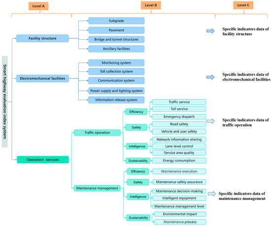 After conducting initial research, an overarching framework for the evaluation system was formulated, as illustrated in Figure 4. The evaluation system’s target layer is segmented into three key indicators: “Facility structure”, “Electromechanical facilities”, and “Operation services”. This segmentation approach primarily considers the current industry model and regulatory framework governing highway operation and management in China. The three main indicators provide a comprehensive description and evaluation of smart highways from construction and operational viewpoints. This segmentation is coherent with the organizational structure of current management departments, thereby streamlining subsequent implementation processes.
