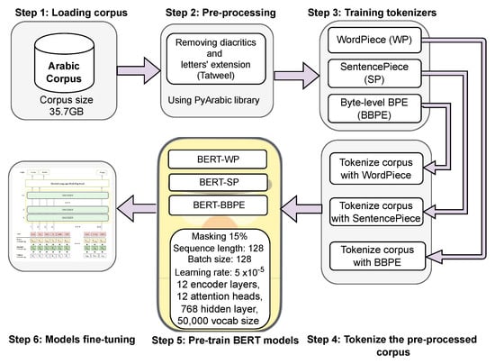 https://huggingface.co/faisalq/bert-base-arabic-bbpe (accessed on 21 May 2024)) while measuring the performance of each model on seven different NLP tasks. The pretraining text corpus underwent a few preprocessing operations using PyArabic [