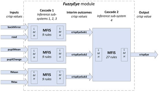 The module utilizes separate fuzzy logic controllers (sub-systems 1, 2, and 3) in Cascade 1 to process subsets of inputs and generate interim outcomes. Each sub-system generates outcomes (crispEyeSub1, crispEyeSub2 and crispEyeSub3). There are 27 rules for combining these fuzzified outcomes (fuzzifiedEyeSub1, fuzzifiedEyeSub2, and fuzzifiedEyeSub3) to produce the fuzzifiedEye value. This value is then defuzzified into the final crispEye output through the fuzzy inference sub-system 4. The rules are shown in Table 5.