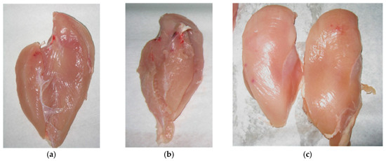 The visual assessment of fresh meat (left fillets), in terms of the frequency and number of petechiae (hemorrhages), was carried out by a trained five-person committee. Criteria for the quantitative assessment of the occurrence of hematomas and defects were developed by Banach [14], taking into account quality problems suggested by the manufacturer. The subject of the fillet quality assessment was hemorrhages occurring in/on the fillet on the outside and inside, with hemorrhages of various sizes (small, ø < 10 mm; large, ø > 10 mm)—Figure 1. The number of present hemorrhages determined the defectiveness of the meat. The assumption that even one hemorrhage, regardless of size, classified the fillet as a defective product was the basis for this assessment criterion.