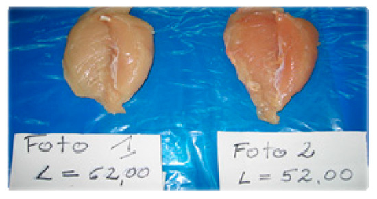 The Hunter Miniscan XE Plus colorimeter (HunterLab, Reston, VA, USA) was used to measure the color of randomly chosen fillets. It was set to collect spectral data with illuminant A/observer D65/10° on the CIELAB scale (L*, a*, b*). Before starting the measurements, the device was calibrated using ceramic reference plates (white and black). Color measurements were performed on fresh meat (approx. 9 h after slaughter, n = 30) and refrigerated meat (7, 9, 12, and 14 days, air temperature approx. 2 °C, n = 6), in 3 repetitions for each sample. Additionally, when assessing the color of the meat, two elements were taken into account: the tenderloin (m.pectoralis minor—MPn) and the fillet (m.pectoralis major—MPj), including the external surface (ES) and the internal surface (IS). To increase the objectivity of the assessment, places with visible defects (e.g., hemorrhages) were omitted during the measurements. Figure 2 shows a visualization of the different colors of the fillets in terms of brightness (L* parameter).