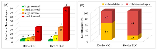 Number of hemorrhages on the external and internal surfaces (A) and defectiveness (B) of the fillets of chickens stunned using the own-construction (OC) and Polish company (PLC) devices. a-b—significant differences between devices, p < 0.01; a-a—no significant differences.