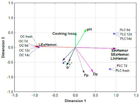 The obtained results were subjected to statistical analysis using the Statistica v.13.1 program. The characteristics of the studied variables were determined (arithmetic mean, standard deviation, variance), and the strength and direction of the relationship between the analyzed objects (device; storage time) and meat parameters were identified at the level of significance of differences (p < 0.05; p < 0.01). Then, PROFIT analysis was performed, which allows for vector scaling (non-linear reduction of dimensionality) and multiple regression analysis [17]. The aim of this analysis was to check the impact of the device used (OC, PLC) and storage time (fresh, 7–14 d) on the assessment of similarities between a set of parameters characterizing meat quality (hemorrhages, pH, Fp, Dp, cooking loss). In the first stage of extended multidimensional scaling, the configuration of points in two-dimensional space was obtained. In the second stage of the Profit analysis, multiple regression was determined using coordinates (independent and dependent variables), presented in the form of a biplot.